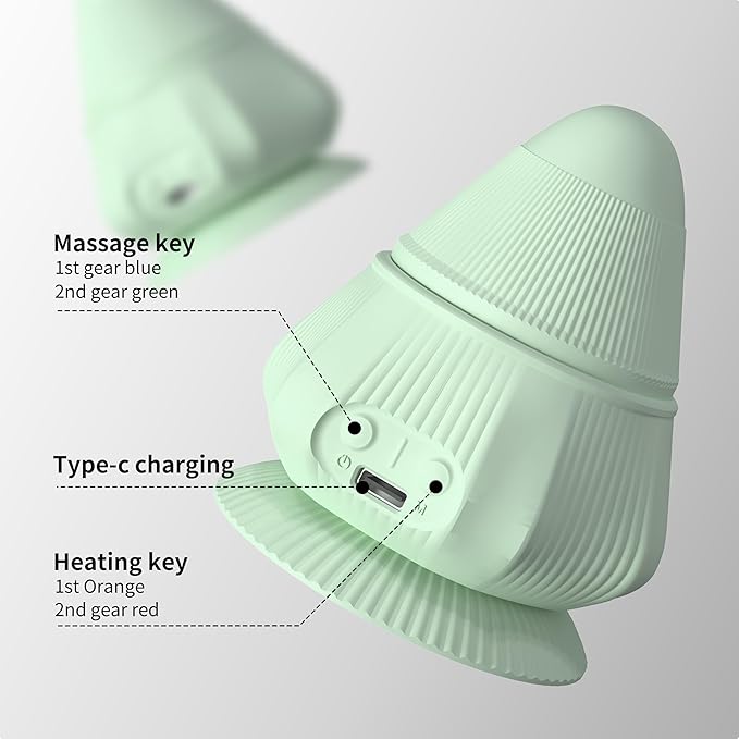 - Dual Mode: Vibration and heat. The vibration has three levels: green light indicator for level 1, blue light indicator for level 2, red light indicator for level 3. The heat mode should be used with the heat massage head, orange light for the first speed at 47°C, red light for the second speed at 51°C.