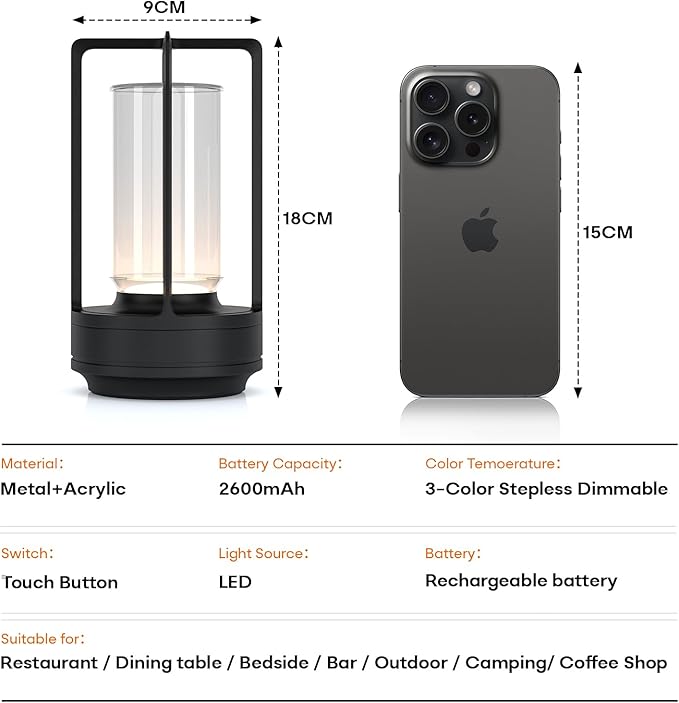 - ๐ [ A perfect gift idea ]: Our touch light lamp can match a variety of scenes and styles while making a great gift. It can be used as an ambient light for Thanksgiving, Christmas and birthday parties. The rechargeable cordless led table lamp is suitable for bedroom, bedside table, office, restaurant, cafe, bar, hotel, outdoor patio lighting, etc.