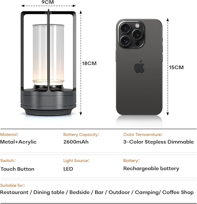 - ๐ [ A perfect gift idea ]: Our touch light lamp can match a variety of scenes and styles while making a great gift. It can be used as an ambient light for Thanksgiving, Christmas and birthday parties. The rechargeable cordless led table lamp is suitable for bedroom, bedside table, office, restaurant, cafe, bar, hotel, outdoor patio lighting, etc.
