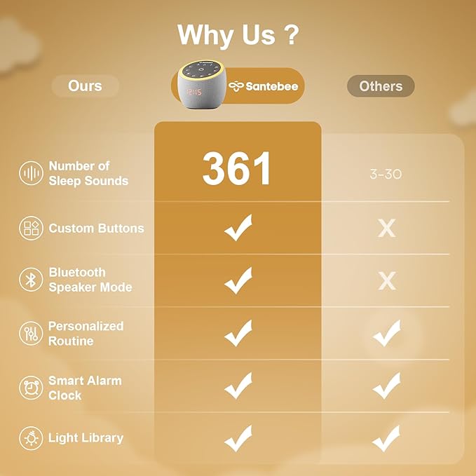 White Noise Sound Machine for Sleeping, 361 Soothing Sounds, Smart APP Control, Custom Buttons, Non Looping Natural Sounds, Bedside Dimmable Clock, Night Light, Santebee for Adults Baby Kids Lullaby