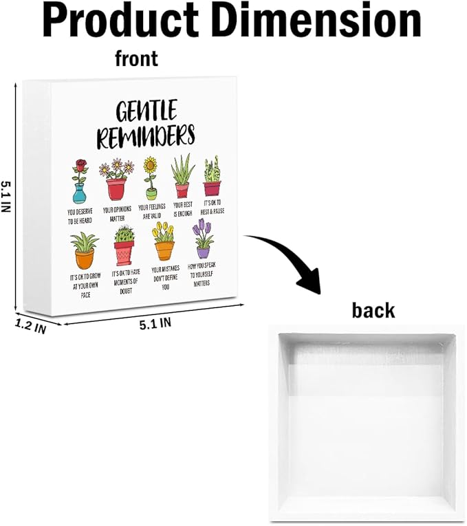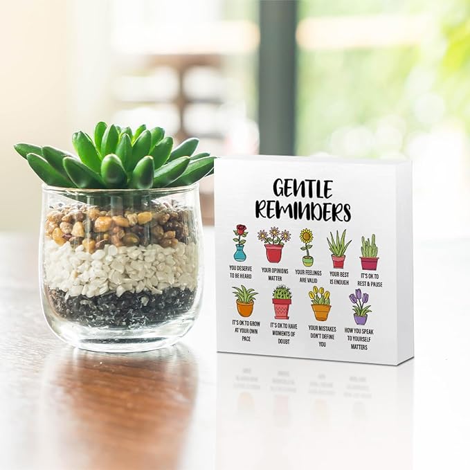 Gentle Reminders Decor Wooden Box Sign, Positive Affirmations Art Decorations, Inspirational Gifts for Women Friend Besties, Rustic Home Therapy Counselling Office Table Decor Wood Block Plaque
