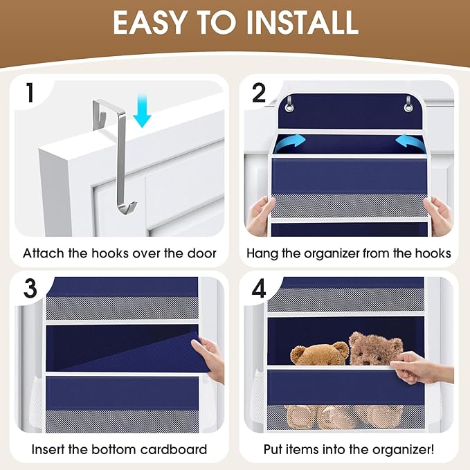 - Easy to Install: first attach the hooks over the door, then hang the room organizer from the hooks, then insert the cardboard into the bottom and finally put items into the storage