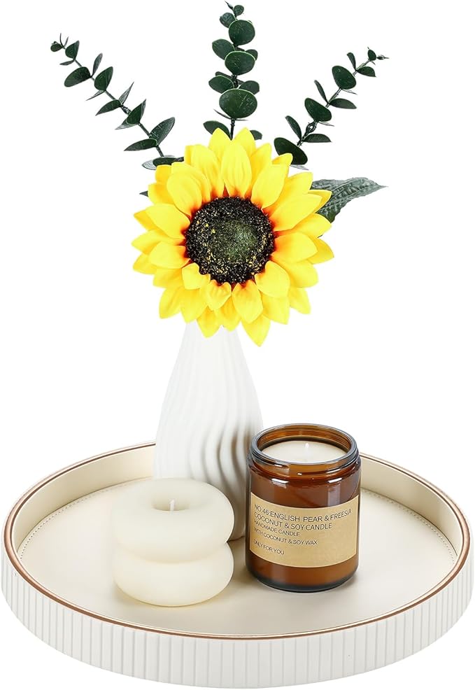 GORESE Round Decorative Serving Tray for Coffee Table Decor, 12" PU Leather Table Centerpiece Home Decor, Valet Tray for Trinket Jewelry Perfume Key, Ottoman Tray Nightstand Organizer, Cream White