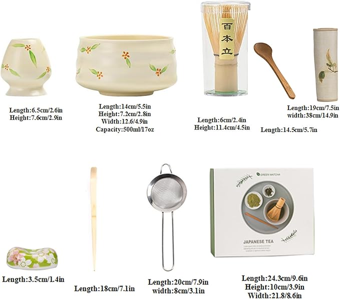 • [Gift Box Packaging]: Scizorito Matcha 8-piece set, 1 tea whisk, 1 tea whisk stand, 1 Matcha bowl, 1 tea stirrer, 1 tea spoon, 1 powder sieve, 1 tea stirrer stand, 1 tea towel.