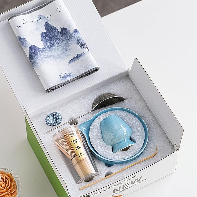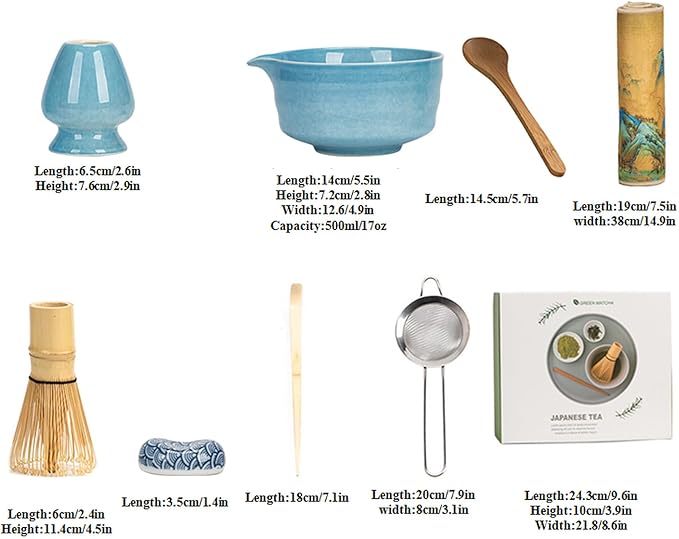 • [Gift Box Packaging]: Scizorito Matcha 8-piece set, 1 tea whisk, 1 tea whisk stand, 1 Matcha bowl, 1 tea stirrer, 1 tea spoon, 1 powder sieve, 1 tea stirrer stand, 1 tea towel.