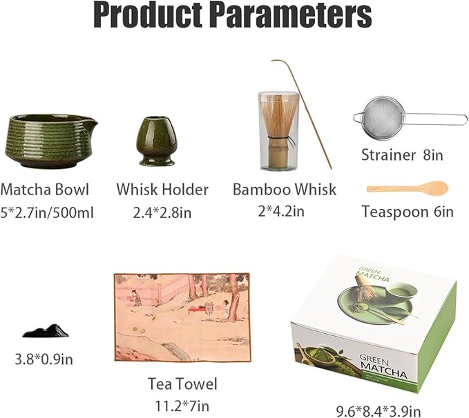- 【Exquisite Matcha Whisk Set】The beautiful matcha kit includes : 1* Ceramic Bowl ( 500 ml/17 oz),1* Bamboo Whisk, 1* Bamboo Spoon , 1* Ceramic Whisk Holder,1* Ceramic Scoop Stand, 1* Tea Cloth,1* Matcha Powder Sifter and 1* Tea Scoop. This matcha set will bring joy to your leisure time. Meet your different usage requirements for making matcha beverages, pastries, and more.