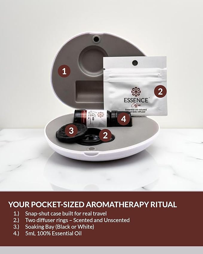 Essence Pearl Travel Case - Wearable Aromatherapy Kit with Nasal Diffuser Rings, Soaking Bay, and 5mL Essential Oil – Portable Wellness Gift Set for On?The?Go Self Care