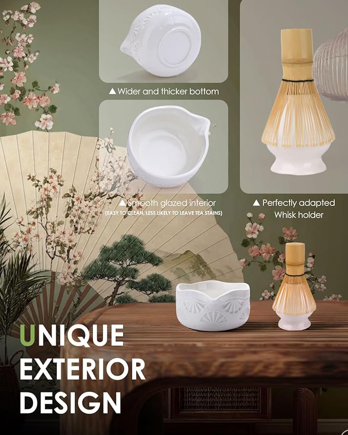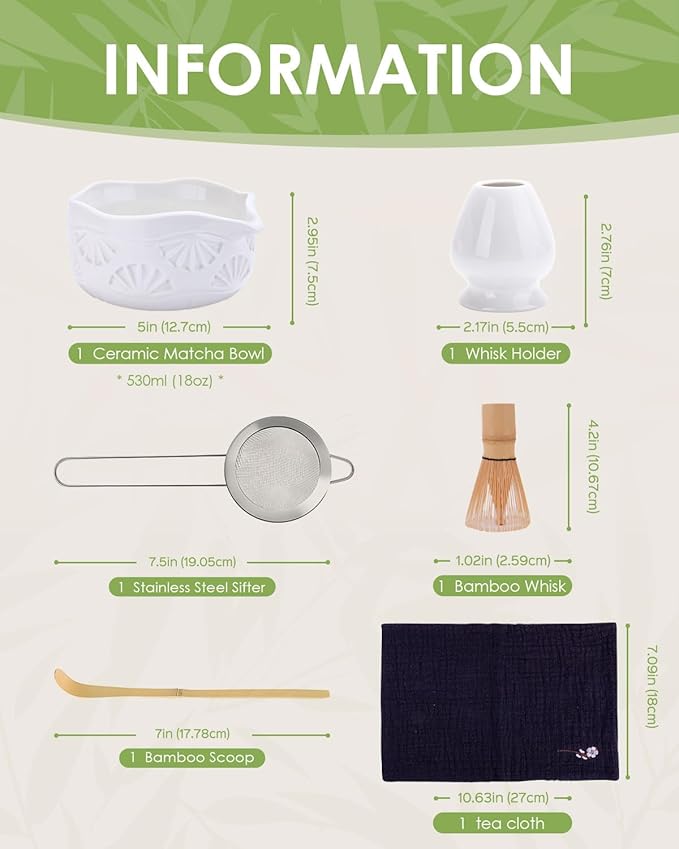 - Complete Matcha Set:This matcha set includes everything needed for an traditional matcha experience: - 1x handmade bamboo matcha whisk (chasen) - 1x bamboo scoop (chashaku) - 1x stainless steel sifter - 1x 530ml/18oz ceramic matcha bowl (chawan) - 1x whisk holder - 1x tea cloth - 1x Hand-Book