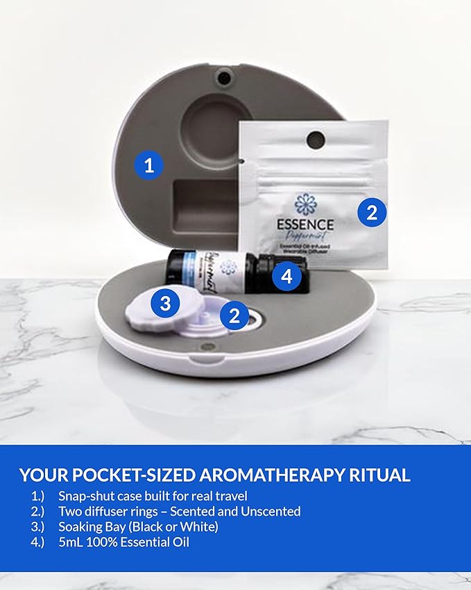 Essence Pearl Travel Case - Wearable Aromatherapy Kit with Nasal Diffuser Rings, Soaking Bay, and 5mL Essential Oil – Portable Wellness Gift Set for On?The?Go Self Care