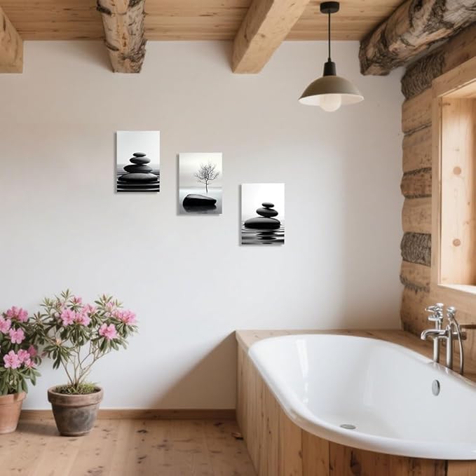 CCWORKERRY 3PCS Zen Stones Canvas Wall Art Black and White Zen Stone Painting Calming Meditation Wall Decor for Yoga Studio Office Spa Bathroom (white,16W x24L x3)