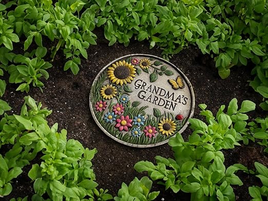 - DESIGN FEATURES: Beautiful 3D hand-painted garden stepping stone featuring vibrant sunflowers, colorful flowers, butterflies, and a ladybug in a charming circular design Transform Gardens with Vibrant Hand-Painted Décor: VEOJEIN Grandma's Garden Stepping Stone brings elegance and charm to any space with its 3D hand-painted sunflower design, bright floral accents, and engraved “Grandma’s Garden” lettering.
