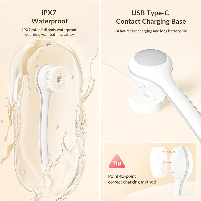 - Two-Speed Electric Bath Brush: Featuring a 360° rotating design with two customizable modes: Gentle mode for first-time users and sensitive skin, and Powerful mode for deep cleansing of oily skin. The intelligent core protection system automatically reduces the brushing strength within 3 seconds if it exceeds safe limits, preventing potential skin irritation