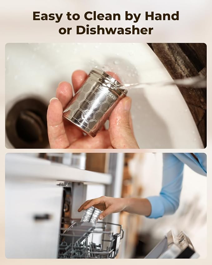 • Easy to Use & Clean: Our updated threaded lid screws on effortlessly, ensuring a tight, secure seal to lock in all tea particles— leaving no particles out of the top during brewing! After use, these loose tea strainers clean up quickly with water or in the dishwasher