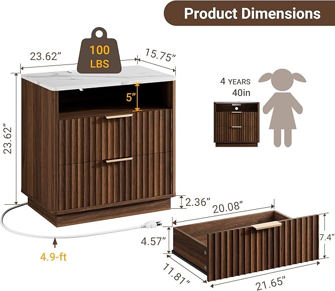 Large Fluted Nightstand Set of 2 with Charging Station, 23" Modern End Table with Faux Marble Top, 2 Drawers Side Table with Storage, for Bedroom Living Room, Curved Profile Design(Walnut)