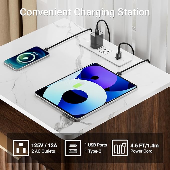 - 【Effortless Charging, Anytime】This nightstand comes with an ETL & FCC-certificated charging station, equipped with 2 AC outlets (125V) and 1 USB + 1 Type-C port (5V/2A). A circular hole on the back enables cable management, keeping the countertop tidy and providing convenience for charging devices like phones, tablets, headphones, desk lamps, etc.