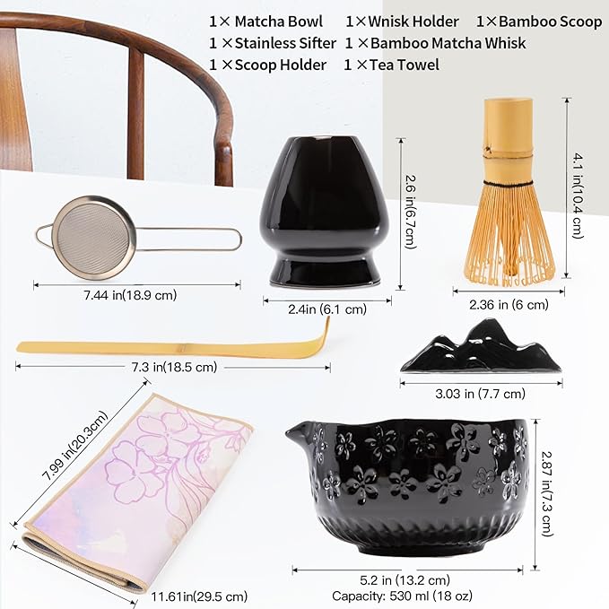 APLSTOW Matcha Whisk Set - Traditional Japanese Handmade Bamboo Matcha Whisk and Holder, Matcha Bowl,Bamboo Scoop, Scoop Rest, Sifter and Tea Towel (Black)
