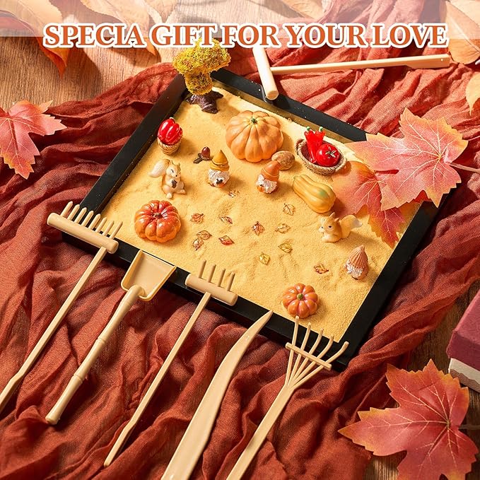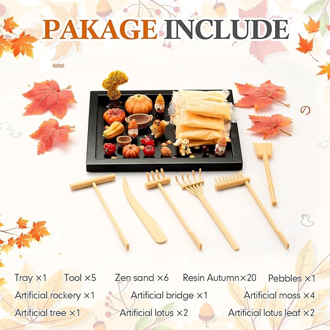 - Create Your Peaceful Sanctuary: step into tranquility with the fall themed zen garden kit; This complete zen sand garden box set offers a serene escape, allowing you to craft your personal haven with vibrant fall ornaments, pumpkins, chilis, maple leaves, squirrel, grape leaves; Transform your space with this zen garden, ideal for meditation and relaxation amidst life's hustle