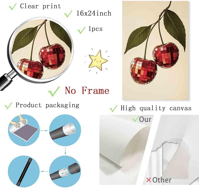 Disco Cherry Wall Art Disco Ball Picture Cherry Preppy Print Trendy Aesthetic Wall Art Preppy Aesthetic Pictures Red Picture Ball Funny Poster Dorm Girls Room Party Theme Bar Decor 16x24inch No Frame