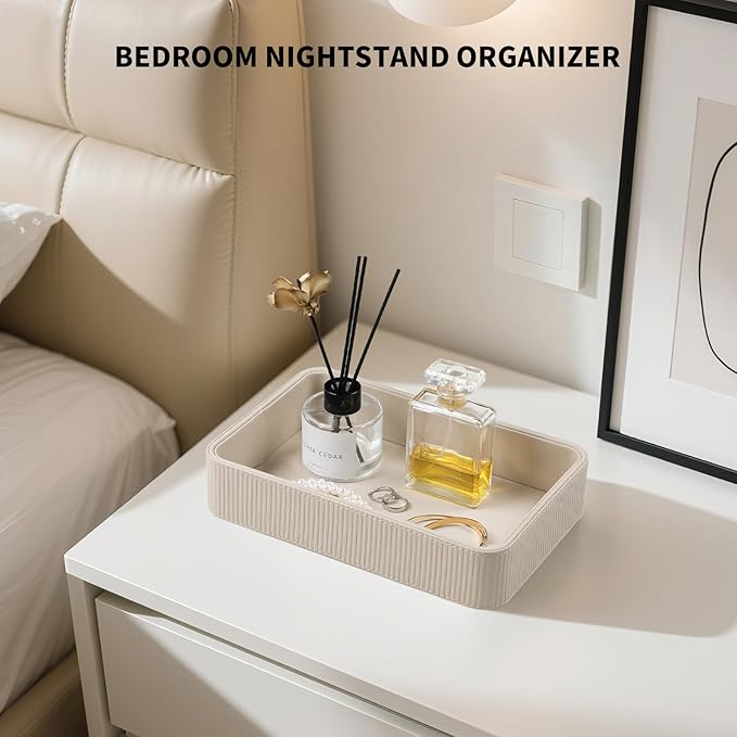 PU Leather Valet Tray Organizer, Modern Nightstand Organizer Bedside Desktop Storage for Womens and Men, Decorative Perfume Trinket Catchall Vanity Tray for Key Watch Wallet (Beige)
