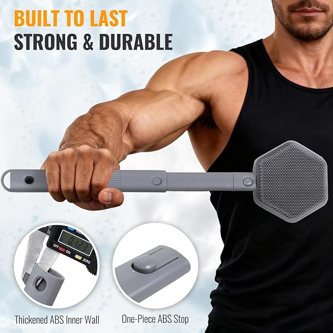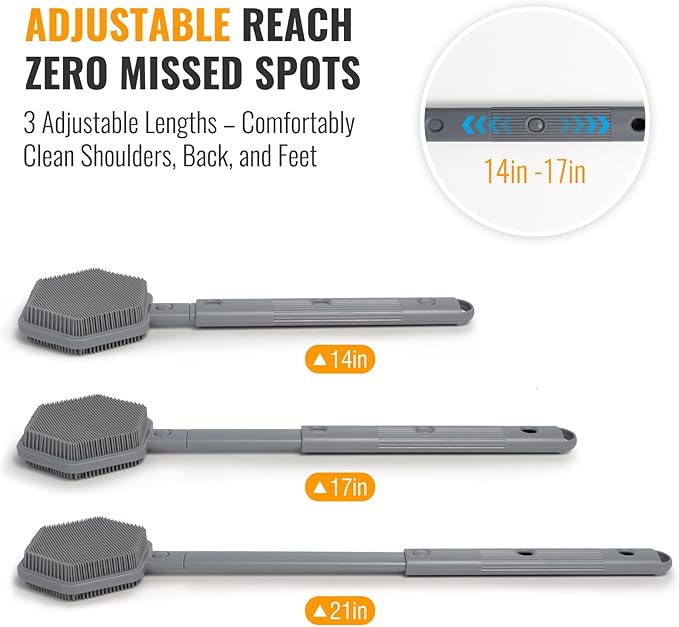 - Conquer Your Shower - Reach Every Inch: Our body scrubber features a 14–21 inch adjustable handle, letting you easily reach your back, shoulders, and feet—no bending, no awkward help needed. Enjoy complete freedom in every shower.