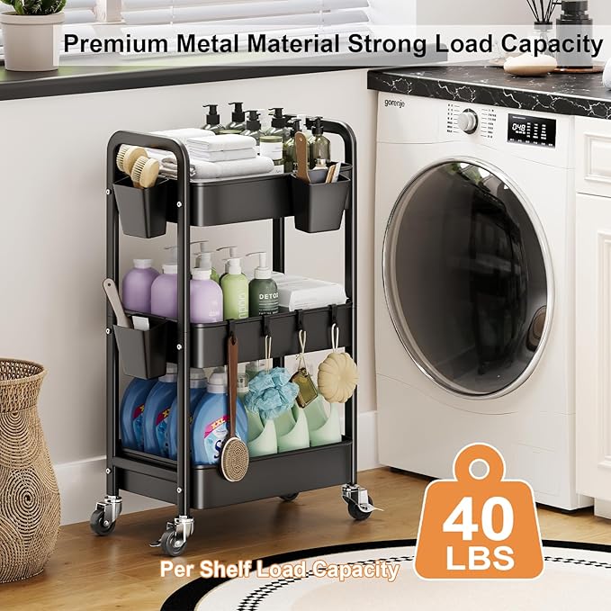 - 【Multi-functional Large Capacity】Featuring 3 spacious baskets, this metal cart serves as a versatile craft station, cleaning organizer, book trolley, art supply caddy, makeup vanity, diaper storage, laundry sorter, or snack transporter. Plus: 3 hanging cups and 4 hooks add extra storage for small items. Ideal for pantry organization and clutter-free spaces.