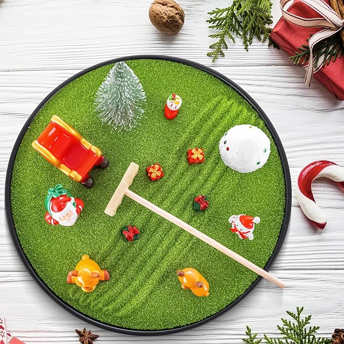 - 【Complete Christmas Decorations】This Christmas zen garden set includes an 8.2-inch round tray, a bag of green sand, a Christmas tree, a Santa Claus figure, a sleigh, a snowman, a snowball, four gift boxes, two elk, a Christmas stocking, and a wooden rake.With these accessories, create your own festive atmosphere.