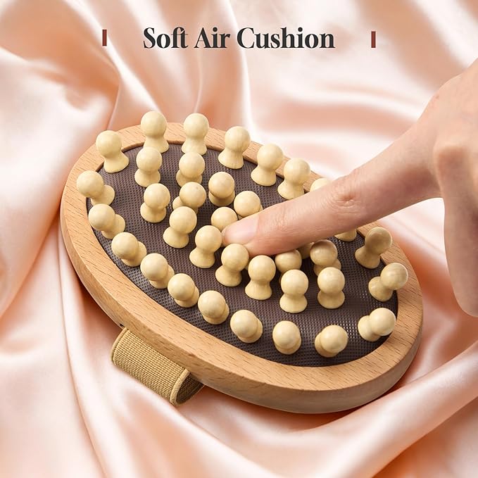- Air Cushion Massage Brush: Crafted with a non-slip cotton strap, a smooth rounded wooden handle, an anti-static air cushion, and 100% natural wooden bristles, this massage brush adapts closely to your skin for a deeper, more effective massage experience.