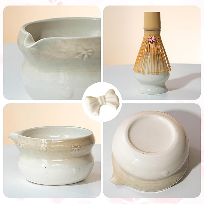 - 8-Piece Pink Matcha Set: 1* Pink Matcha Bowl (470 ML/15.8 Oz), 1* Bamboo Tea Whisk, 1* Teaspoon, 1* Bamboo Tea Scoop, 1* Ceramic Matcha Whisk Stand, 1* Ceramic Scoop Stand, 1* Cotton Tea Cloth (Chakin), 1* Matcha Powder Sifter. Every item in this Matcha Whisk Set is carefully designed to make your Matcha experience effortless and stylish.