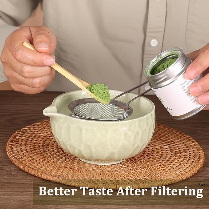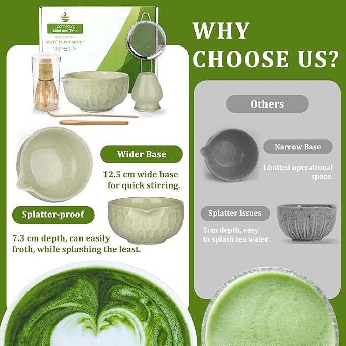 - 🌸 Complete Matcha Making Set】This exquisite matcha set, featuring a stone-grain texture and a green glazed bowl, Our philosophy:Slow down and Integrate into a healthy lifestyle.Our matcha kit includes essentials for an authentic matcha experience f: 1×14 oz Ceramic Matcha Bowl, 1× Bamboo Matcha Whisk, 1×Whisk Holder,1× Bamboo Scoop, 1×Spoon and 1× Stainless Steel Sifter. This matcha set makes it effortless for beginners and tea enthusiasts alike to enjoy a calming, frothy cup of matcha.